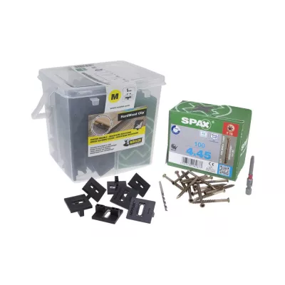 Kit de fixation invisible Hardwood Mini M écartement entre lames 5 mm contenant 85 clips avec renfort en acier inoxydable, 100 vis Spax inox A2, embout Torx, foret taillé meulé et manuel d'instruction.