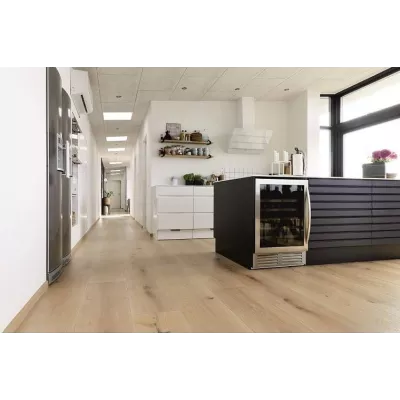 Parquet Boissec Chêne sur support bois massif pour créer un intérieur acceuillant qui invite à passer du temps, avec crête et rainure, quelques petits noeuds